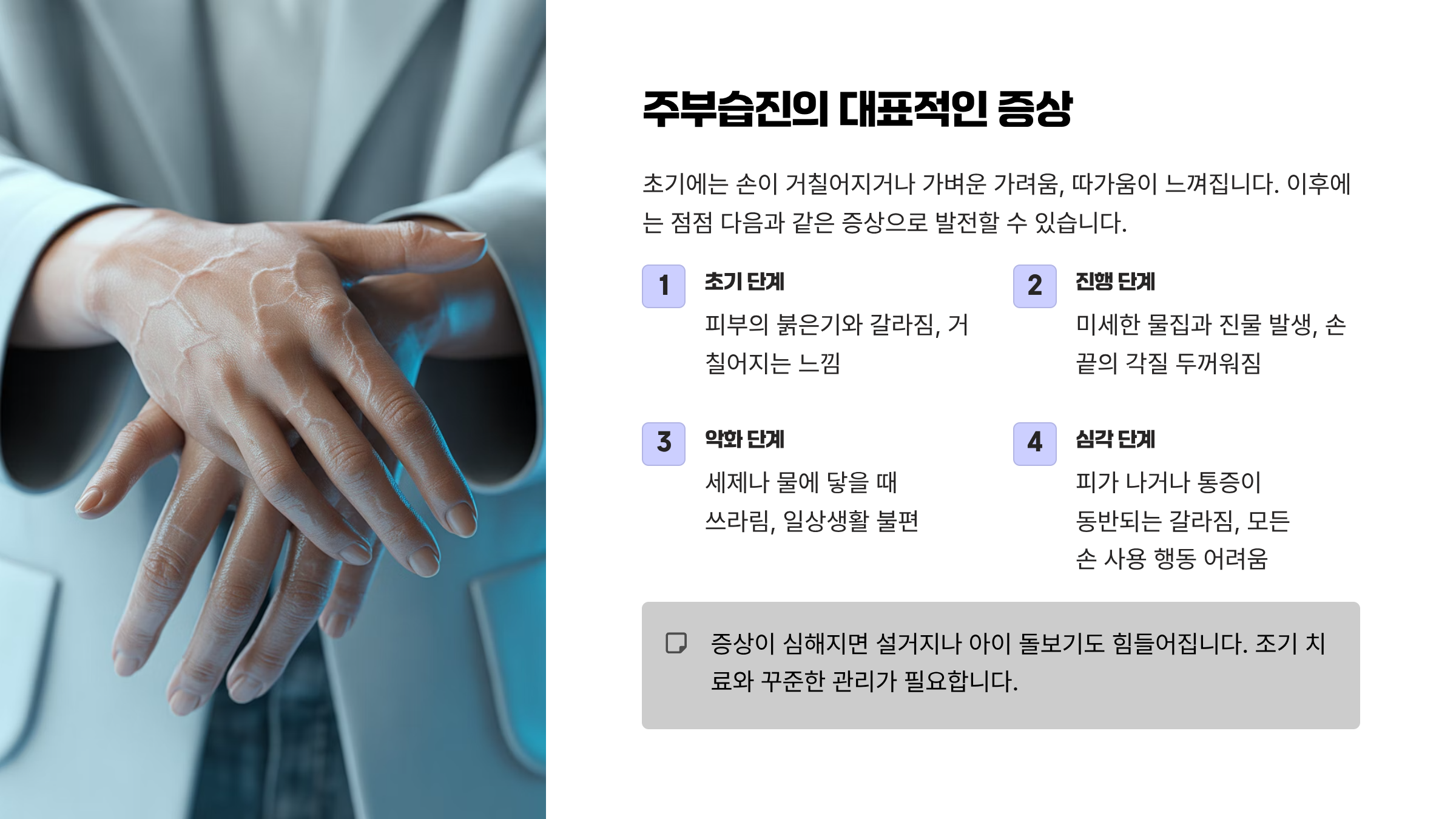 갈라짐, 물집, 진물, 통증으로 이어질 수 있어 조기 관리가 중요합니다.