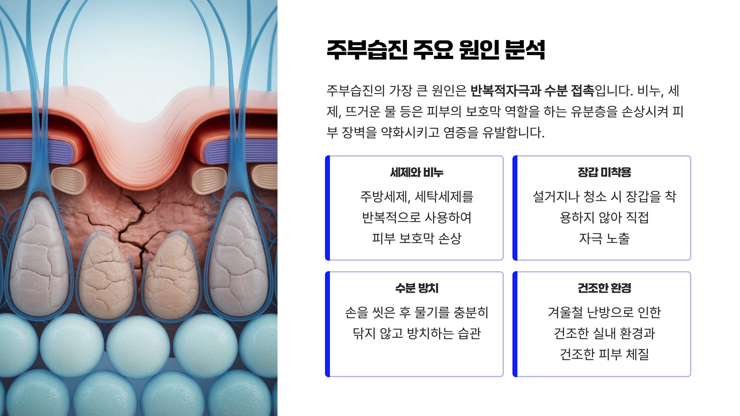 주부습진의 가장 큰 원인은 반복적인 자극과 수분 접촉입니다.