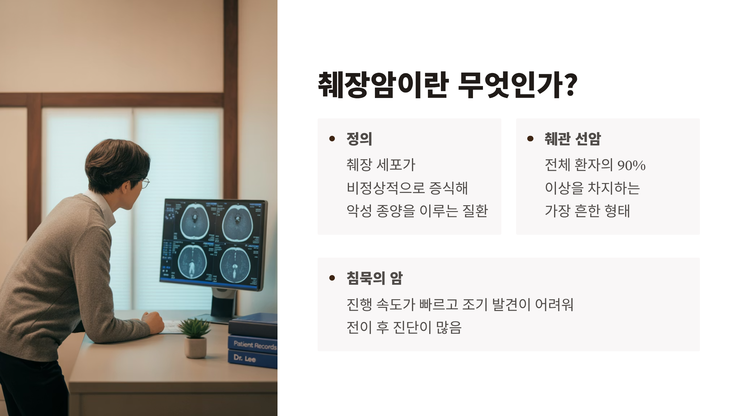 췌장암은 췌장의 세포가 비정상적으로 증식해 악성 종양을 이루는 질환이다. 이 중 가장 흔한 형태는 **췌관 선암(adenocarcinoma)**으로 전체 환자의 90% 이상을 차지한다. 진행 속도가 빠르고 조기 발견이 어려워 ‘침묵의 암’으로 불리며, 다른 장기로 전이된 상태에서 진단되는 경우가 많다.