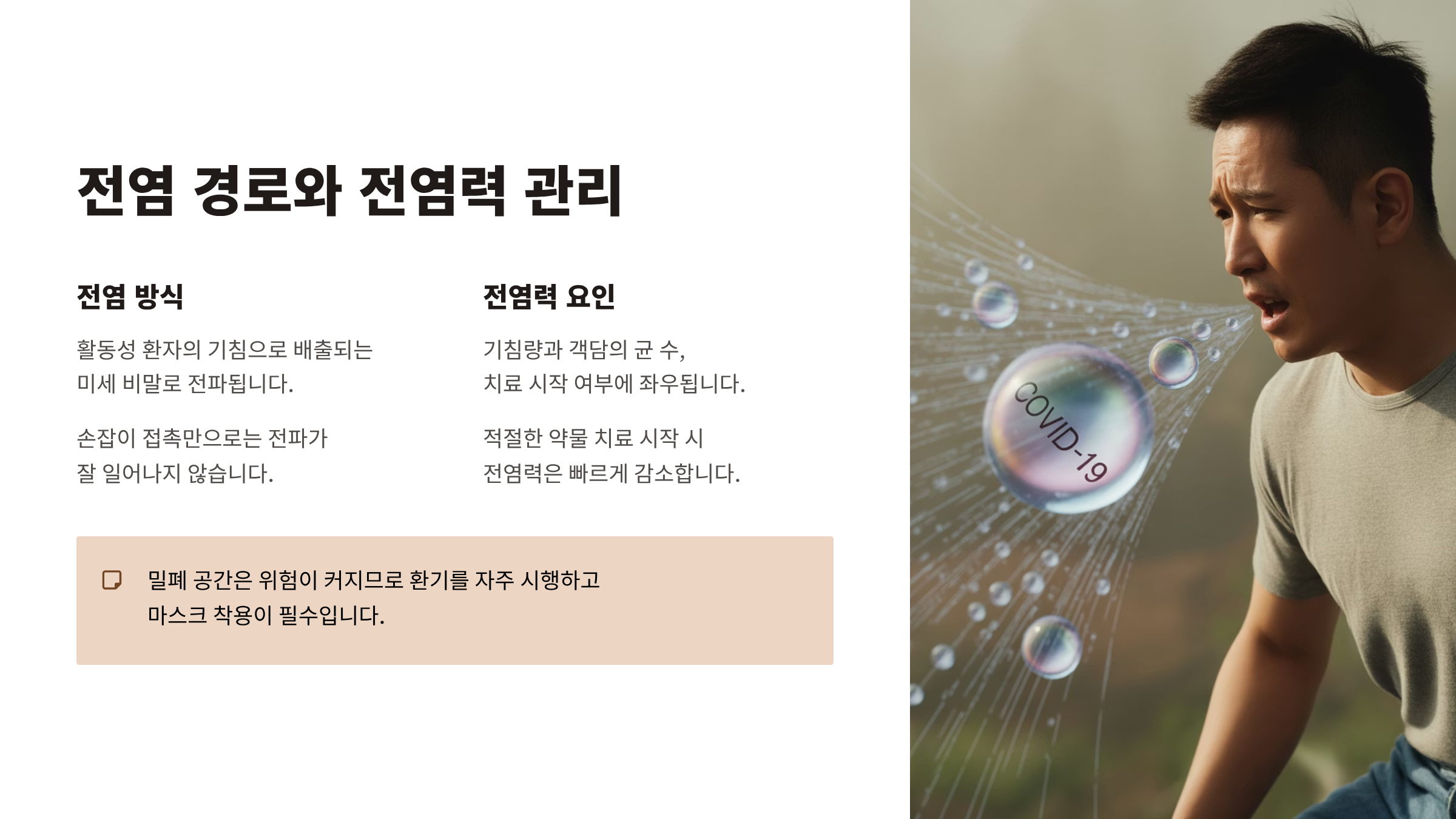 환기는 전파 차단의 기본이며 마스크 착용과 조기검진이 중요합니다.