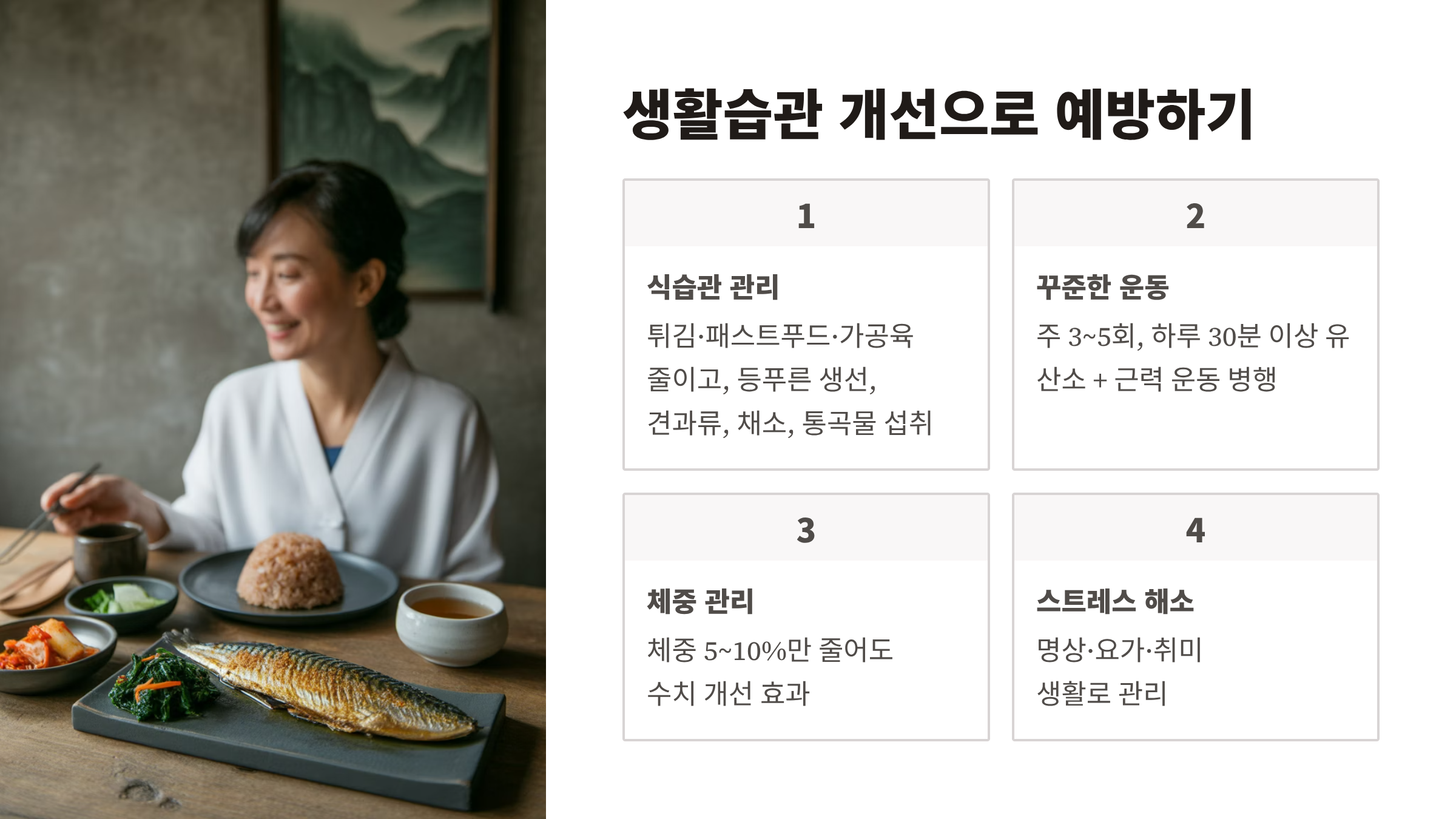 - 식습관 관리: 튀김·패스트푸드·가공육 줄이고, 등푸른 생선, 견과류, 채소, 통곡물 섭취
